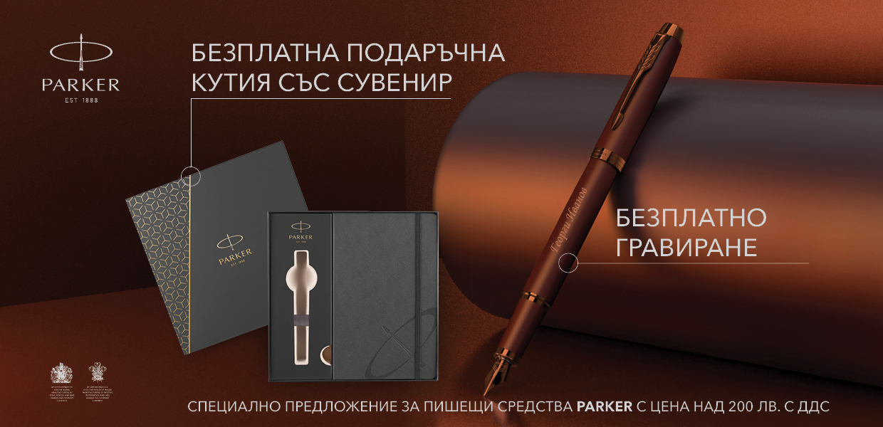 - Гравирането на метални химикалки, писалки и ролери Parker със стандартна лазерна гравюра (една позиция) e БЕЗПЛАТНО за продукти с цена на дребно над 200 лв. с включен ДДС.